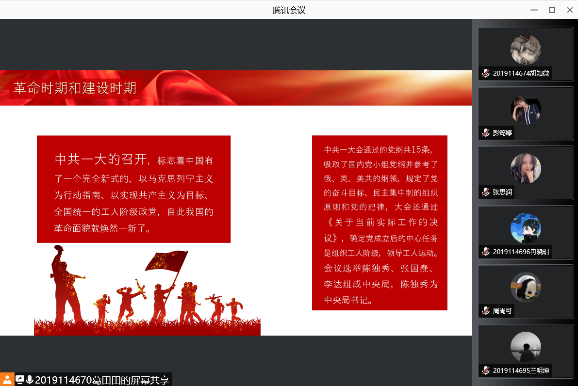 10月22日晚七点,19级统计一班召开了主题为“热烈庆祝中国共产党建党100周年”的秋季开学第一堂团课。会上,团支书与同学们共同回顾了中国共产党走过的百年历程,了解了当前我们党的历史任务,并结合青年人在国家社会发展中的重要作用,展望了未来的国家发展前景。