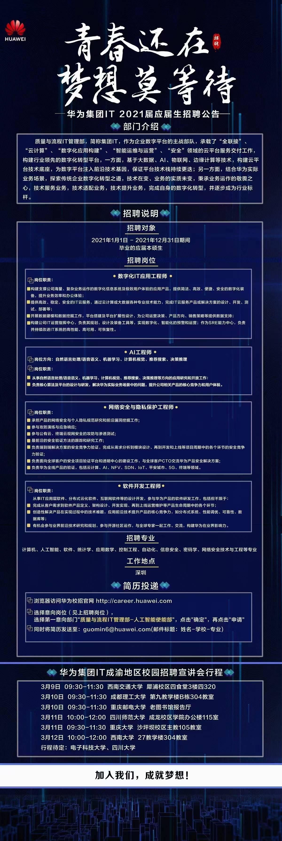 华为集团IT应届毕业生时时彩计划 专场招聘会,时间:2021年3月9日晚上7:00,地点:四食堂三楼317会议室